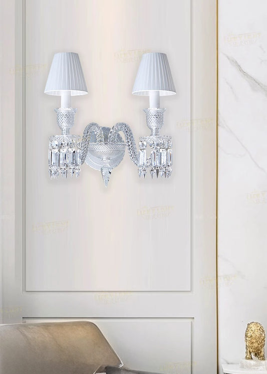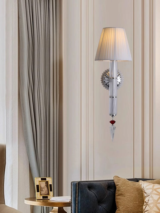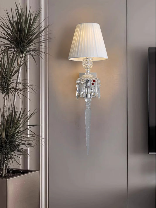 This elegant crystal wall sconce features a sleek, modern design with a fluted glass body that exudes sophistication. The sconce is topped with a classic white pleated lampshade, which softly diffuses the light, creating a warm and inviting ambiance. A delicate crystal ornament hangs below, adding a touch of luxury and refinement. Perfect for enhancing the decor of any room, this sconce serves as a stunning focal point.